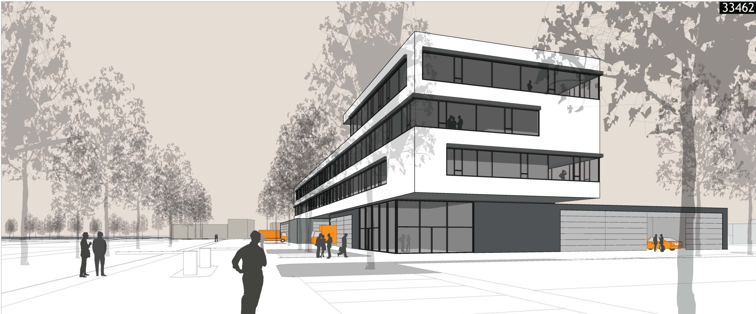 Die Baumassen sind entlang der Erschließungsstraße zum Gelände der Kläranlage positioniert. Damit erfolgen eine Fassung der Straßenführung und eine Abschirmung der hinter den Gebäuden angeordneten Lagerflächen zur Straße hin. Die Zufahrten zum Grundstück und zu den Garagen sind so angeordnet, dass der vorhandene Baumbestand im vollen Umfang erhalten werden kann. Der Baukörper ist so aufgebaut, dass in zwei separaten Blöcken im Erdgeschoss die Garagen und Lagernutzungen und ein Großteil der Werkstattnutzungen untergebracht werden können. Dabei wurde auf eine räumliche Trennung der Nutzungen für den Klärwerksbetrieb sowie für den Kanalbetrieb geachtet. Die Einrichtungen für den Klärwerksbetrieb sind den vorhandenen Nutzungen der Kläranlage zugeordnet, die Nutzung für den Kanalbetrieb befindet sich in Nähe der Hauptzufahrt. Über den beiden Werkstatt- und Garagenblocks ist im 1. und 2. Obergeschoss ein dreibündiger Büroriegel angeordnet, der sozusagen das Bindeglied darstellt und zugleich die Fernwirkung dominiert.