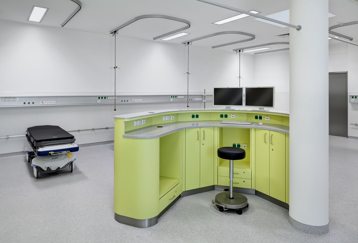 Für die neu errichtete Notaufnahme wurden gemeinsam mit den Nutzern die Durchläufe von gehenden, liegenden und polytraumatisierten Patienten analysiert und neu definiert. Als Kriterien standen hierbei eine zügige und damit wirtschaftliche Durchlaufsteuerung sowie eine optimale Versorgung der Patienten im Vordergrund.