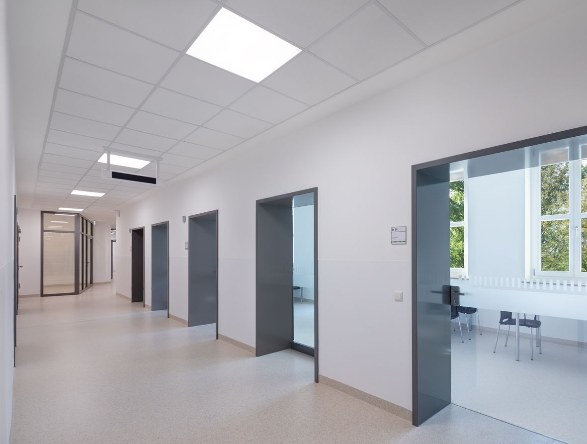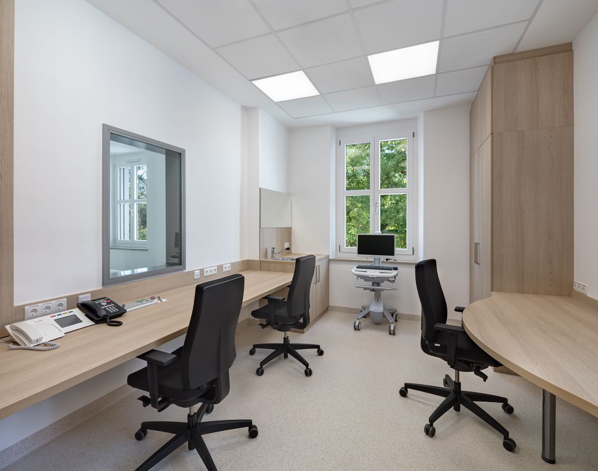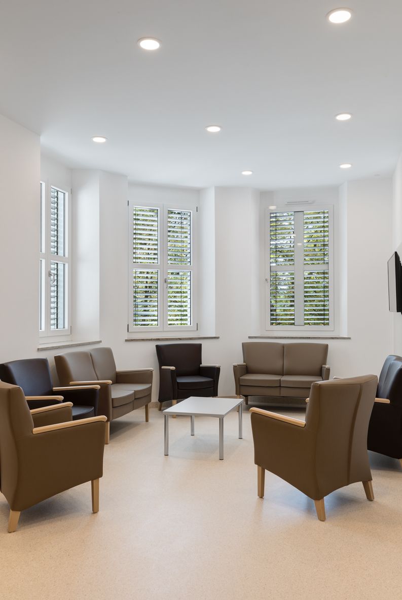 Die Anordnung der Räumlichkeiten wurde mit Bedacht geplant: Patientenzimmer und Gemeinschaftsbereiche wie Speiseraum und Aufenthaltsraum/Wohnzimmer finden sich bevorzugt im sonnigen Süden. Funktionsräume und Pflegeeinrichtungen sind so platziert, dass kurze Wege gewährleistet sind. Ärztezimmer, das Patientenbad, Stationszimmer und die Verwaltung wurden zentral positioniert, um einen reibungslosen Ablauf der Pflege zu ermöglichen. Technikräume wurden an strategisch günstigen Stellen untergebracht.