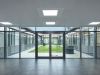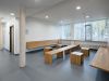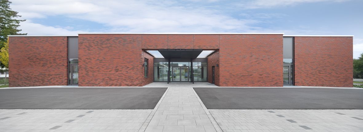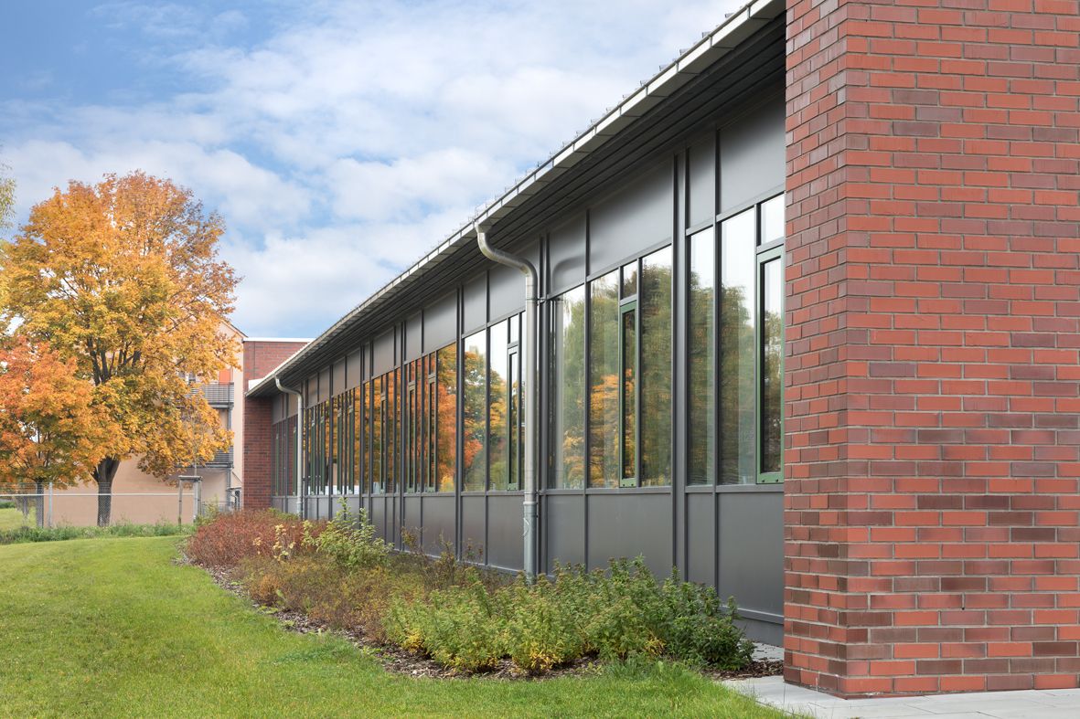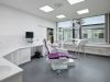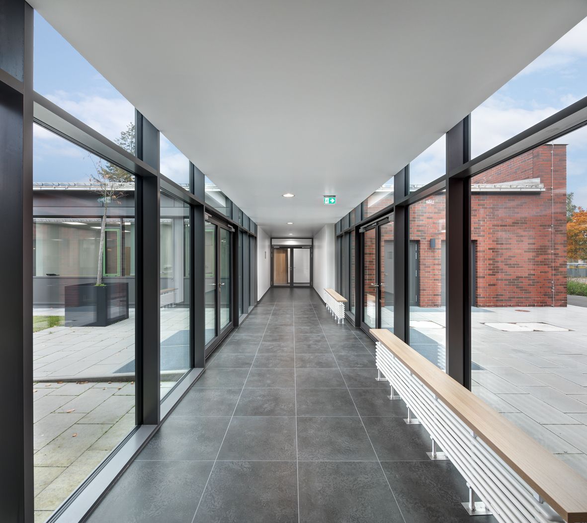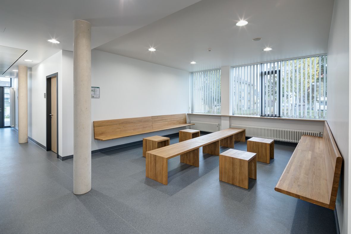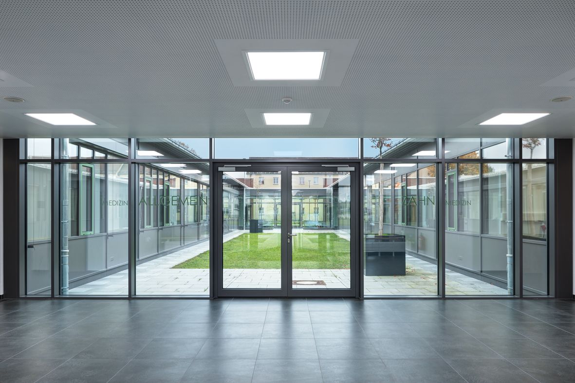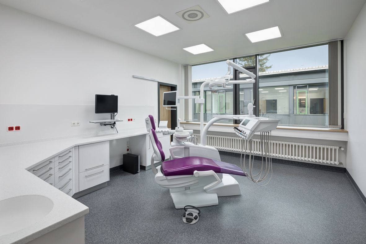 Über eine Eingangshalle/Sammelpunkt erreicht man im Norden die Leitung mit Besprechungsraum, Wartezone mit Anmeldebereich, Ambulanz mit Untersuchungs- und Behandlungsräumen sowie Arztdiensträumen und zum Innenhof orientiert die Funktionsdiagnostik und Notfallräume. Im südlichen Gebäudetrakt ist die Leitung des zahnärztlichen Bereiches, eine Wartezone mit Anmeldung und Geschäftszimmer nach Süden hin orientiert, zum Innenhof nach Norden befinden sich Zahnbehandlungsräume mit Röntgenraum, Sterilisation und Nachbehandlung. Jeweils an den Gebäudeenden und nach Innen orientiert wurden die erforderlichen Technikräume und WC-Anlagen angeordnet. Die Längsfassaden sind als Pfosten-Riegel-Konstruktion mit Panelfeldern ausgebildet, um auf die unterschiedliche Raumteilung und Raumfunktion optimal reagieren zu können, ohne ein heterogenes Erscheinungsbild zu generieren. Durch die Leichtbauweise im Innenausbau ist ein Höchstmaß an Flexibilität gegeben.