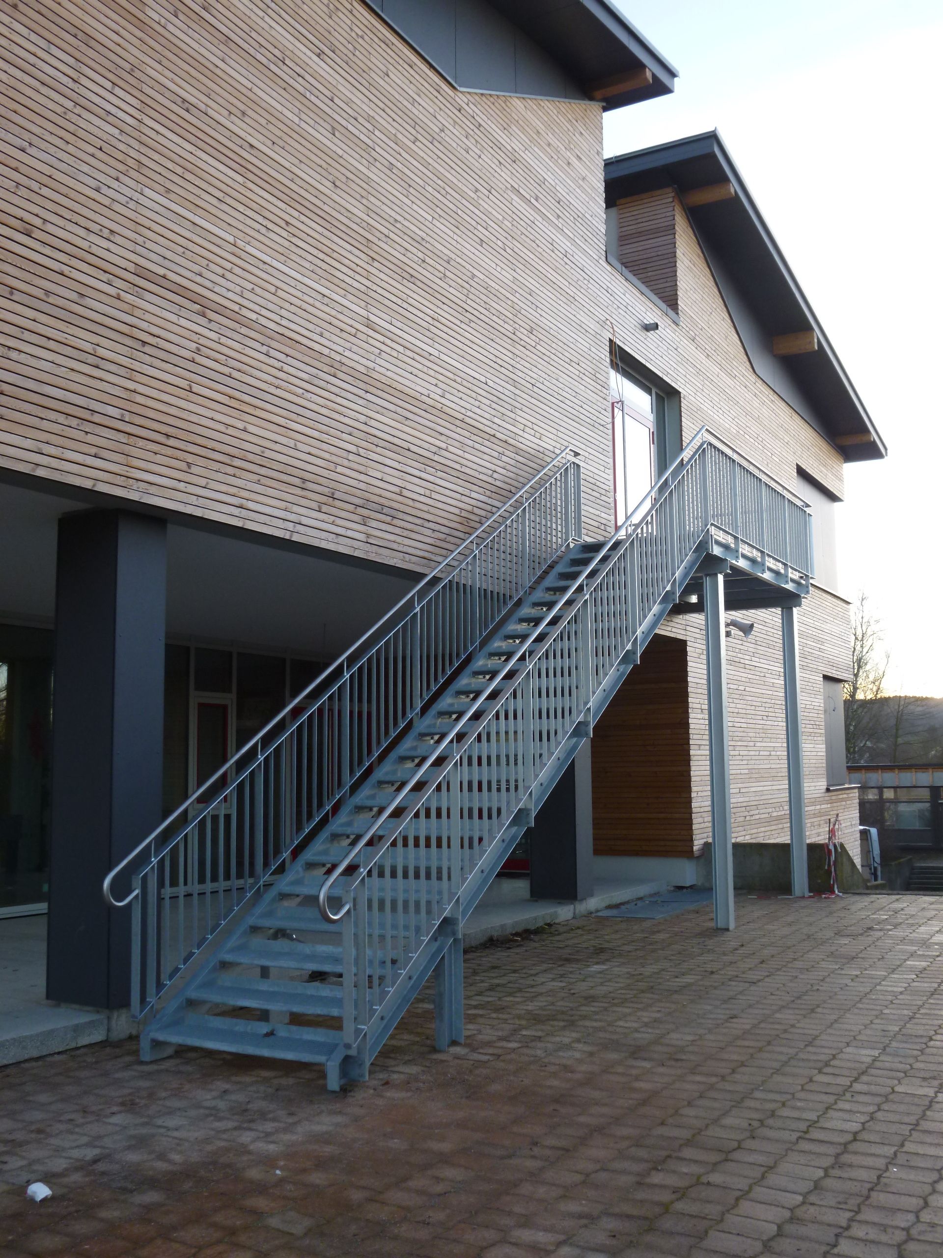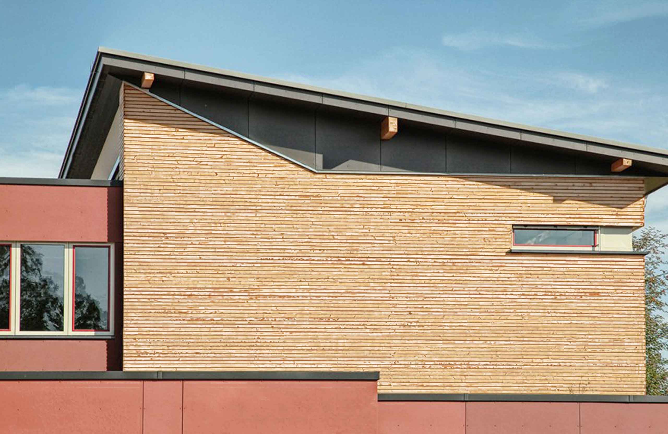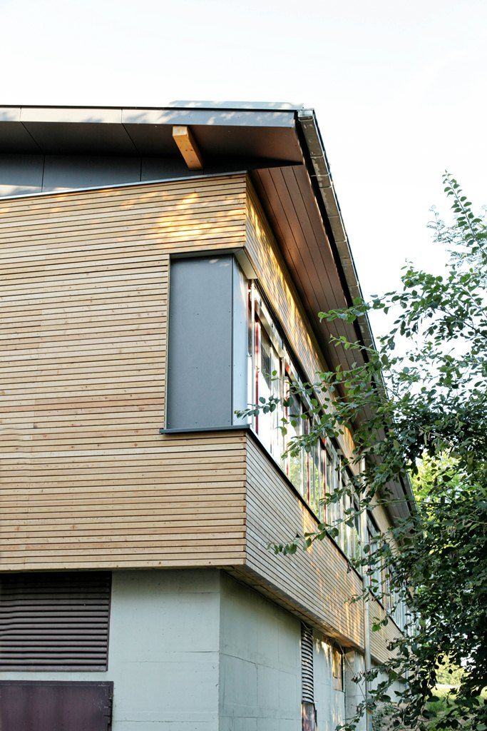 Das Schulgebäude, ein Stahlbetonskelettbau war ursprünglich in Flachdachbauweise mit Shed-Oberlichtern konstruiert und besaß eine Sichtbetonoberfläche. Die Wärmedämmung betrug in den messbaren Bereichen ca. 3 cm. Die Hauptdächer der Schule wurden im Oktober 2007 als Pultdach mit Blecheindeckung ertüchtigt. In diesem Zusammenhang wurde eine Wärmedämmung von 16 cm eingebaut. Die Flachdächer über den Fluren und Teilen der Innenhalle wiesen noch die ursprüngliche Flachdachkonstruktion auf. Die Beheizung der Schule erfolgt derzeit über Elektronachtspeicheröfen. Ende der 90-er Jahre wurde die Turnhalle saniert. Planungsziel war, im Rahmen einer energetischen Sanierung das Gebäude wieder in eine stimmige Gesamtkonzeption zu bringen. Die Flachdachbereiche blieben erhalten. Die dazugehörigen Fassaden erhielten eine Verkleidung mit großflächigen Faserzementplatten und einer hinterlüfteter Dämmung. Die Fassaden mit Pultdach wurden mit waagrechten Lärchenholz-Leisten verschalt und ebenfalls gedämmt. Die Fenster zu durchlaufenden Bändern zusammengefasst, welche die lagenhafte Wirkung des neuen Erscheinungsbildes unterstützen.
