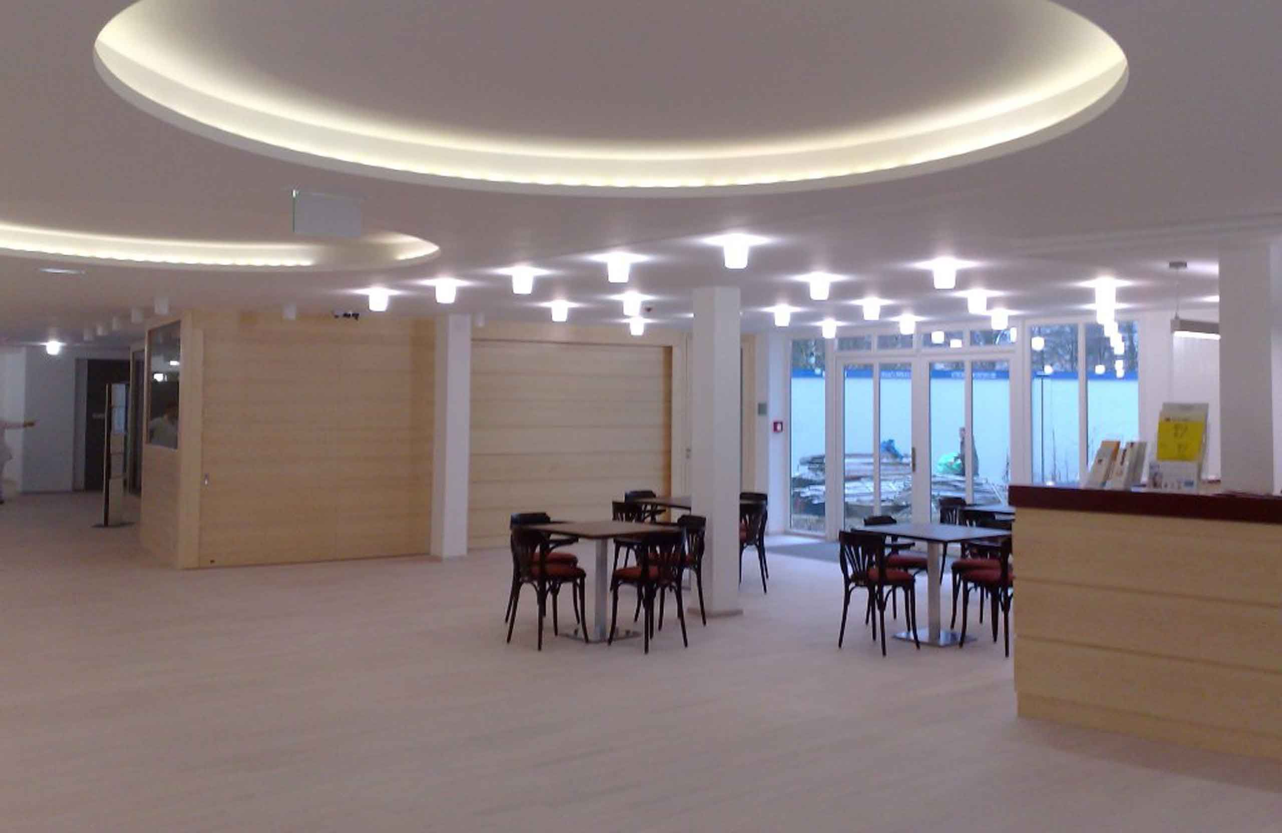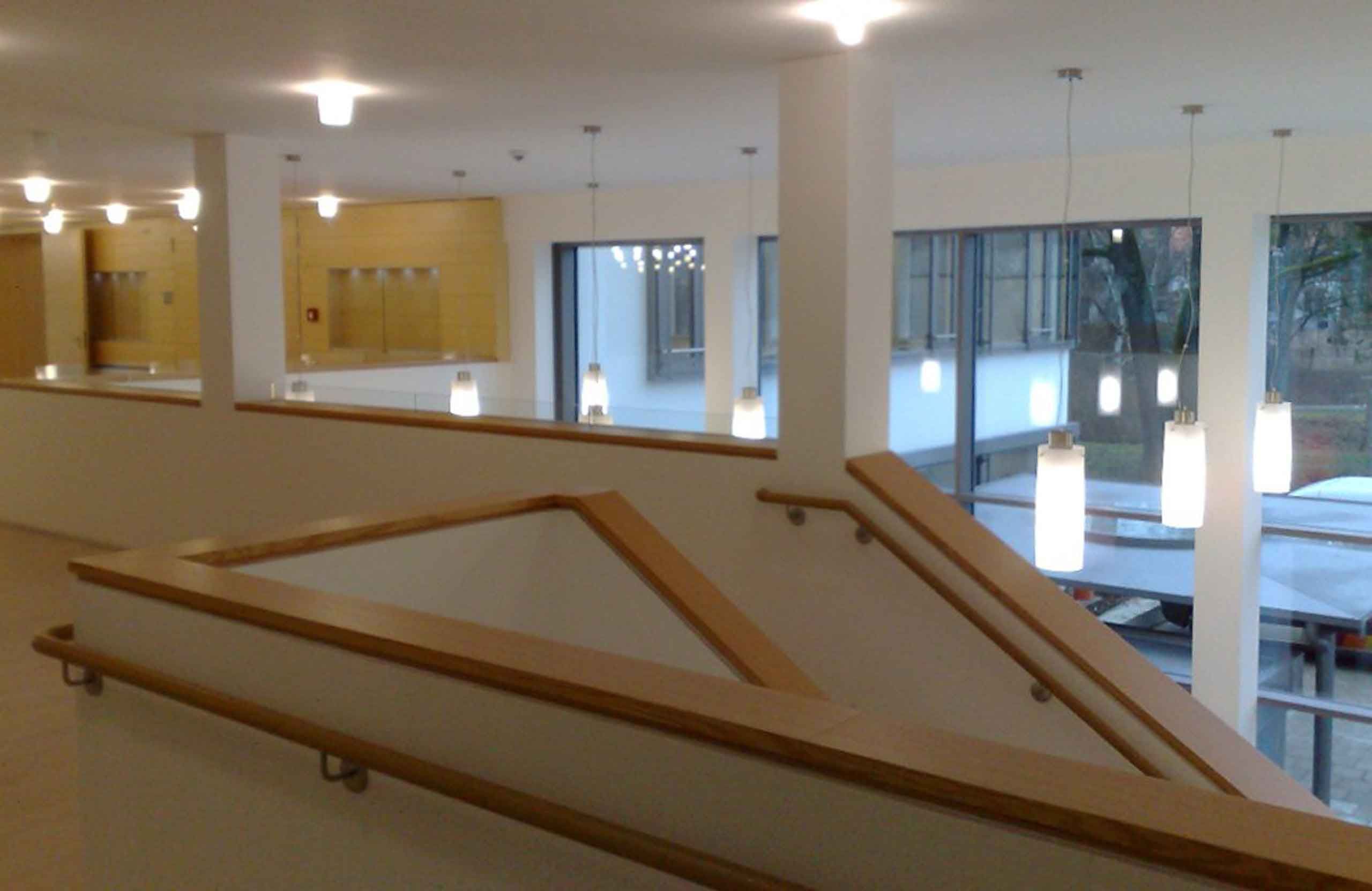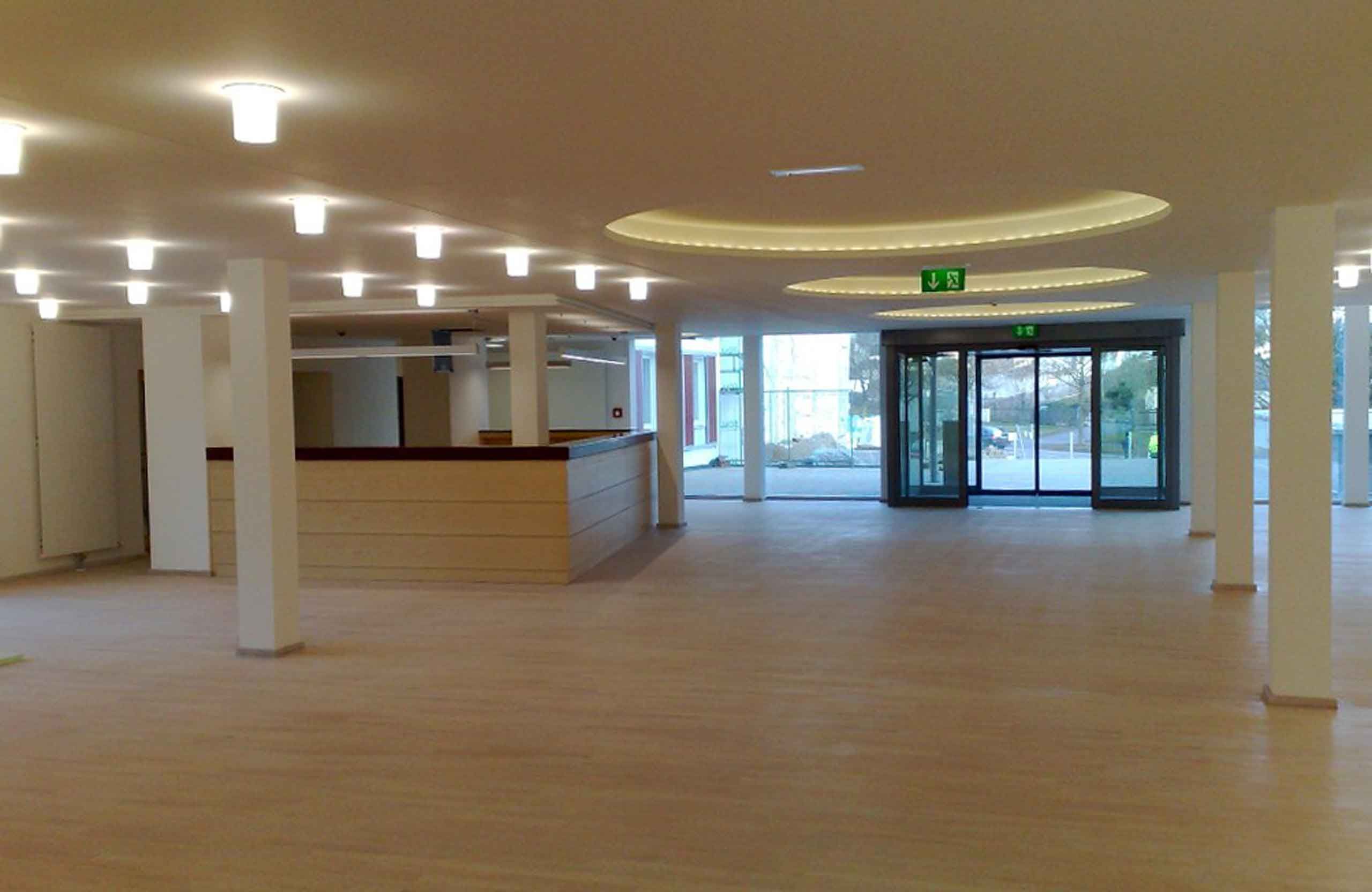 Der kellergeschossig angesiedelte E-Bau wurde ebenfalls saniert und beinhaltet Lagerräume, Garagen und die Anlieferung des Caterings.