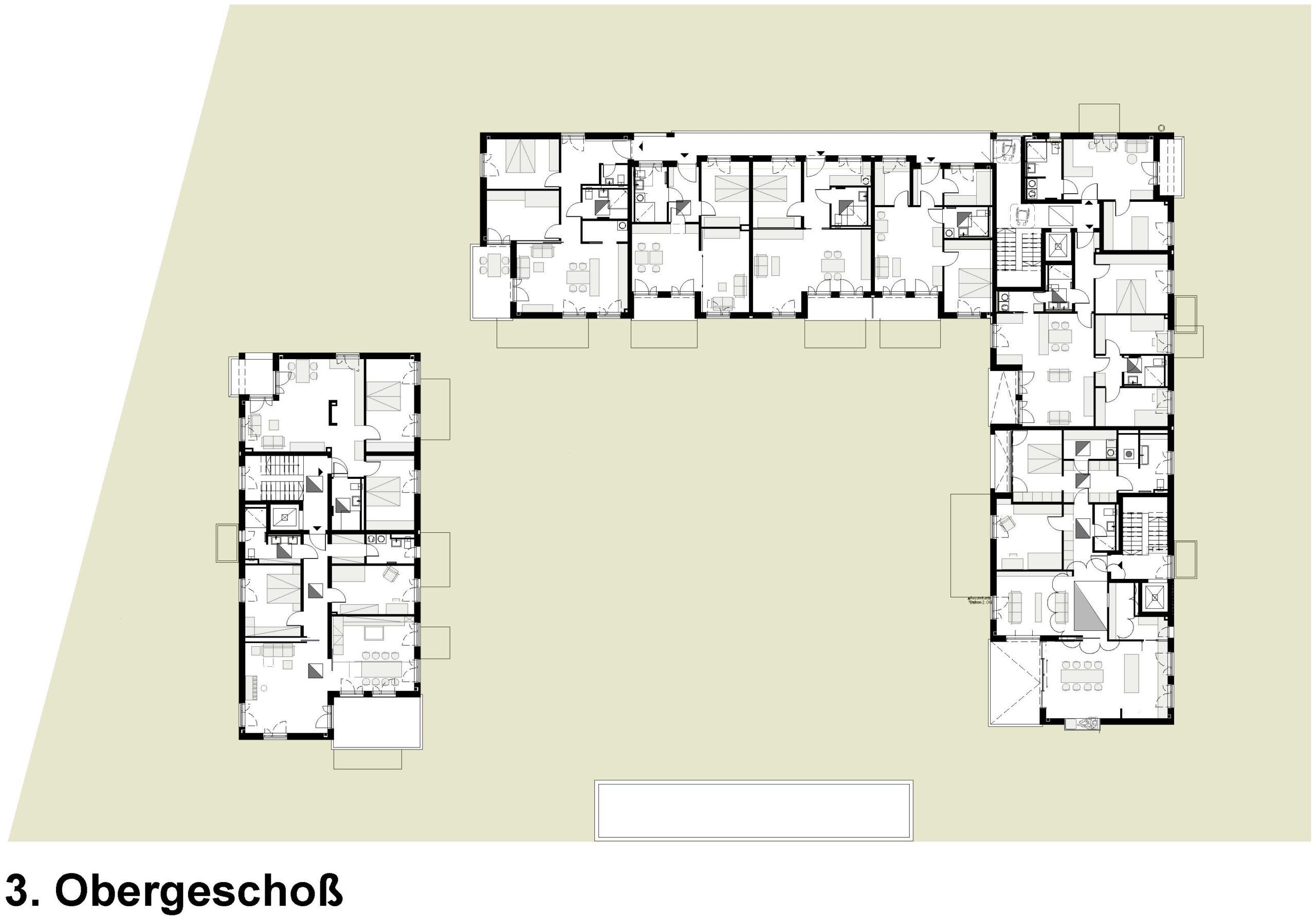 Die Wohneinheiten werden über je ein Treppenhaus mit Aufzugsanlage vom Keller bis zum 3. OG erschlossen. Der Innenhof ist im EG von jedem Treppenhaus aus unmittelbar erreichbar. Sämtliche Wohnungen verfügen über Terrassen oder Balkone, die barrierefrei erreicht werden können. Sowohl im EG als auch im Kellergeschoss wurden Gemeinschaftsräume geplant. Alle Wohneinheiten, die Tiefgarage und die Gemeinschaftsräume sind barrierefrei erschlossen. Die Wohnanlage wird in besonders effizienter Massivbauweise ohne Polystyrolhaut errichtet (Energieeffizienzklasse KfW 70 gemäß EnEV 2013). Warmwasser und Heizung sollen mit regenerativen Energien erzeugt werden.